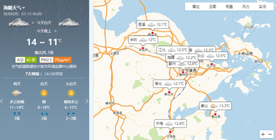 市气象台06时发布,今天阴有时有小雨,明天多云转晴。今天偏北风3~4级;明天偏北风3~4级,傍晚起西北风2~3级。今天最高气温13~15度;明天最低气温7~9度。