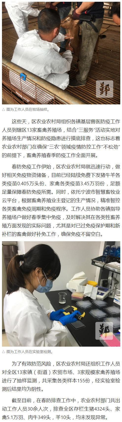 这些天,鄞州区农业农村局组织各镇基层兽医防疫工作人员到辖区13家畜禽养殖场,结合“三服务”活动实地对养殖场生产情况和防疫隐患进行摸底排查,这也标志着农业农村部门在确保“三农”领域疫情防控工作“不松劲”的前提下,畜禽养殖春季防疫工作全面开展。