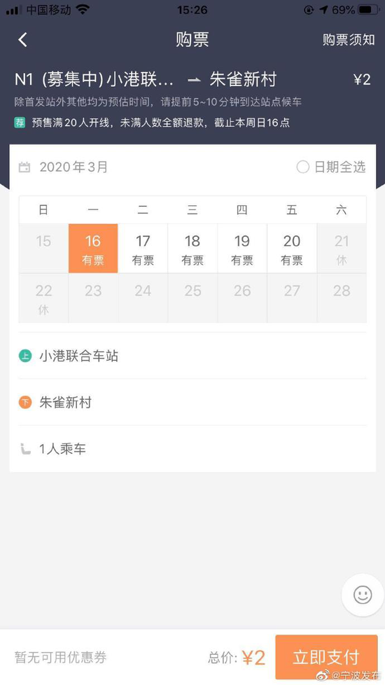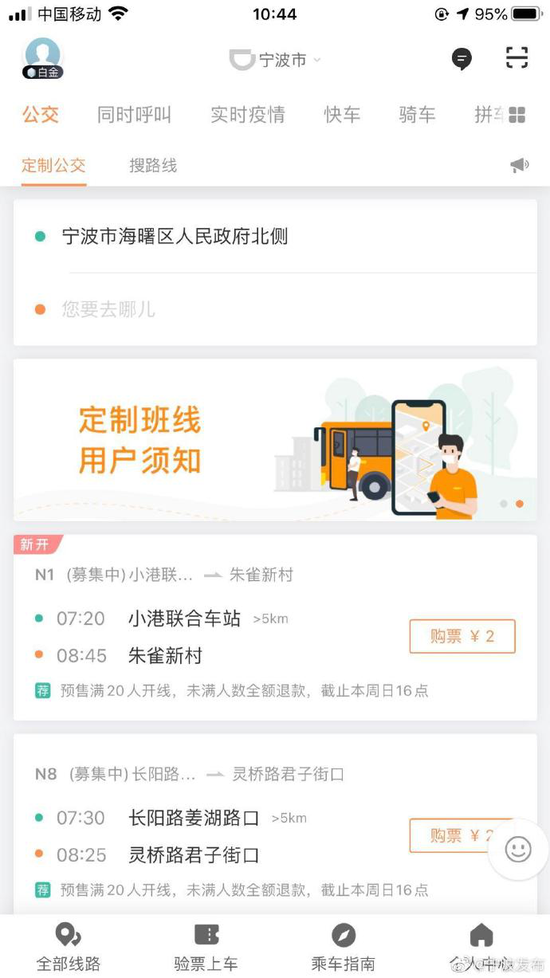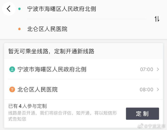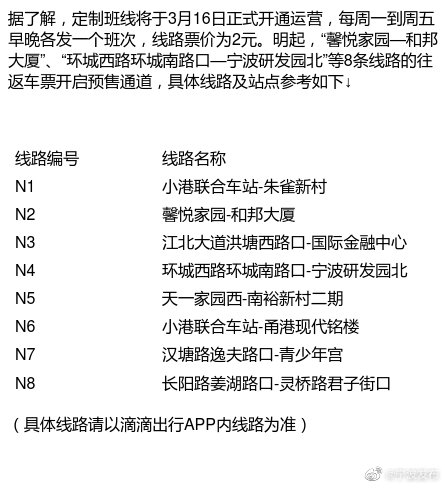为更好地为宁波市民提供疫期复工通勤服务,宁波公交集团联合滴滴出行拟开通“疫期复工定制班线”。经过前期在线募集个人通勤需求、整体统计评估,明天起,“馨悦家园—和邦大厦”等8条线路将开启网上车票预售通道,市民可按需定制自己的通勤路线。