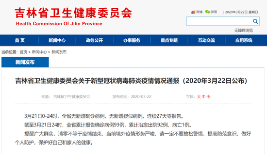 截至3月21日24时,吉林省累计报告确诊病例93例,累计治愈出院92例,病亡1例。