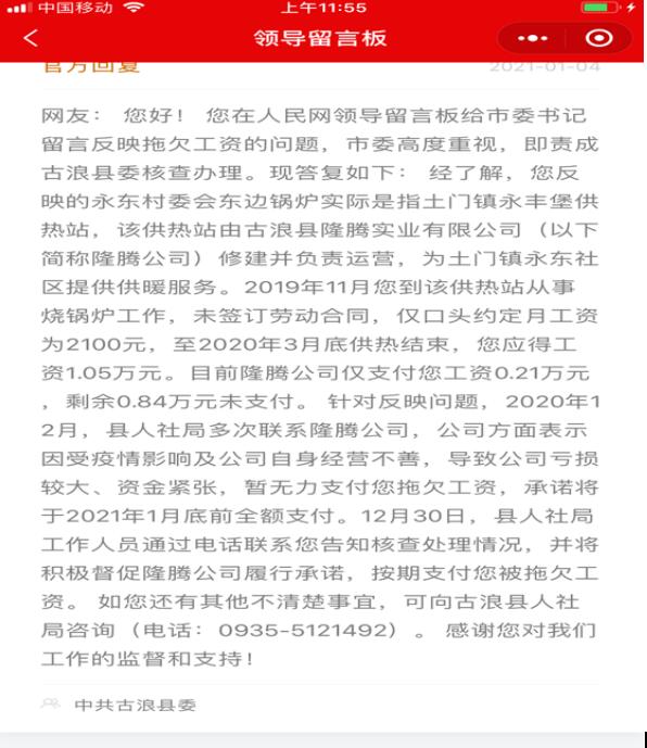 甘肃古浪:患病村民何时才能拿到拖欠的血汗钱 独立撰稿人李堂平 法讯君接到甘肃武威市古浪县村民王泰山的多次求助:隆腾公司欠他工资一直不付。古浪县劳动监察大队的通过电话答复是2021年1月15号支付,人民网留言回复是2021年1月底支付,时至今日还未支付劳动工资!患病四年多,看病费用和家庭开销也大。最近几个月没钱去看病复查,家里取暖煤炭也维持不了多久! 王泰山是古浪县土门镇永丰堡东村村民,2017年7月中旬,他不幸得了模型肾病二期,双下肢浮肿特别厉害,住院,吃药,复查花了不少钱,这真是雪上加霜!截止2018年9月,王泰山住院四次,花费不少,体力活不能干。他就向村委会申请低保,多次申请,提交诊断证明,却杳无音信。 2019年11月迫于生计的王泰山带病找到了一份工作:在永东村东边的古浪县隆腾实业有限公司修建并运营的永丰堡供热站从事烧锅炉工作,没有签订劳动合同,仅口头约定月工资为2100元。到了2020年的3月底供热结束,他没有上班了,而他仅拿到了一个月的工资即2100元。拖欠的8400元工资他要了多次再没有得到一分钱,只是在11月2日给他出具了一份结算单。 结算单 给隆腾公司周总多达16次电话 要了多次工资未果的王泰山无奈之下于2020年12月12日在人民网的“领导留言板”给武威市委书记留言反映《干活容易要工资难》,2021年1月4日得到了古浪县委答复:2020年12月,县人社局多次联系隆腾公司,公司方面表示因受疫情影响及公司自身经营不善,导致公司亏损较大、资金紧张,暂无力支付您拖欠工资,承诺将于1月底前全额支付。12月30日,县人社局工作人员通过电话联系您告知核查处理情况,并将积极督促隆腾公司履行承诺,按期支付您被拖欠工资。 领导留言板回复 而古浪县劳动检查大队给王泰山的电话回复说是1月15日前付清! 到了2021年1月23日,王泰山去找劳动监察大队,监察大队工作人员让他们到土门镇政府协商解决。找到土门镇镇长,他给隆腾公司管理人员打电话对方说他们穷到家了,没有钱支付工资,光去年就赔了多少多少万。就这样一拖再拖,不了了之。 给古浪县劳动监察大队9次电话 王泰山说他本人身患肾病不能干重体力活,只能靠这些钱维持生计,却迟迟拿不到血汗钱。他说,我一个大小伙每月挣那么一点工资确实是实属无奈,却得不到回报!我也是在没别的办法才多次找您求助! “农民工工资不能拖欠啊!”这句话喊了多年!仅仅8400元,就那么丁点,王泰山靠它拿点药买点煤,只能过个不算好的年!法讯君不相信隆腾公司拿不出来这点钱,因为这也许是救命钱啊!但愿王泰山被拖欠的工资能早日拿到。 ![]() |