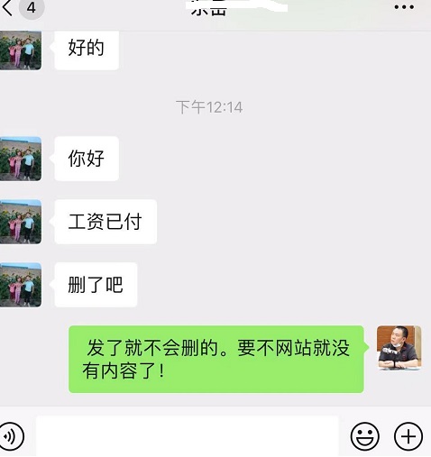 前天(2月2日)法讯网发布的《甘肃古浪:患病村民何时才能拿到拖欠的血汗钱》后,引起强烈反响。当事人已经在昨天(2月3日)领到了拖欠的工资。 2月3日12时许,当事人王泰山发来信息:工资已付。删了吧。法讯君答复:发了就不会删的,要不网站就没有内容了。 当事人发来的领条和微信收款截图。并表示:他们全在这。 法讯君为患病村民王泰山感到高兴,当即为此发了朋友圈,特说:不好意思,文章是不能删除的。七台河人民医院当时发了解决问题后当事人也是要求删除。这不可能! 王泰山再次发来信息:刚把钱发了。谢谢。删了吧。法讯君答复:不能删的,可以写个后续说工资已发,见朋友圈。他便发视频通话给我,吃饭的法讯君不予理睬。 之后自称古浪县人社局的徐述才添加了法讯君的微信。 饭后法讯君出去办事,接到了显示甘肃武威市的电话,对方言语不清。最后听明白说是王泰山,还是要求删帖。我答复说不可能。然后一普通话的口音传来,自称是古浪县人社局的工作人员。他要求删帖。法讯君答复不可能。对方说对王泰山也不好。法讯君说发了朋友圈说了工资已经领到。对方说不够,法讯君答复明天发个后续说工资已经领取。对方说今天写了发。法讯君答复不能。而后对方几次说今天写了发。法讯君生气了:你说今天就今天啊?我为什么听你的?我在外办事呢!听此,对方才说那明天早点吧。 办事回家,才发现微信里那个古浪县人社局的徐述才发来语音电话。 而据了解,现场去的有古浪县公安的、劳动监察大队的、社保局的、土门镇的,龙腾公司的人。 古浪公安去做什么呢?他们拿的个执法仪,问王泰山怎么联系的法讯君。并说:后果想没想,舆论性多强。还问收费了没有?给了多少钱?答复说没有收费,确确实实没有收费。他们说不可能免费为你做的,是不是事成之后付费?答复是说没有,让他们看了聊天记录,说是没收过费用。之后的重点就是让删帖。 这么多部门去村委,那处罚了隆腾公司没有?王泰山说没有。法讯君微信询问古浪人社局的徐述才,没有回应。 下午六时许,患病村民王泰山朋友圈发布消息,感谢古浪县诸多人士帮他要回了血汗钱。 对此,法讯君要说的是:古浪县对舆论的重视值得肯定,及时处理解决问题也值得赞扬。唯一不足的是不应该大动干戈地要求删帖,这不画蛇添足吗?假如法讯君和你们的思维同步,收取了弱势群体的王泰山的钱而写稿发布,岂不是牢狱加身了? 看来,为弱势群体发声,真他妈的难啊!(李堂平) ![]() |